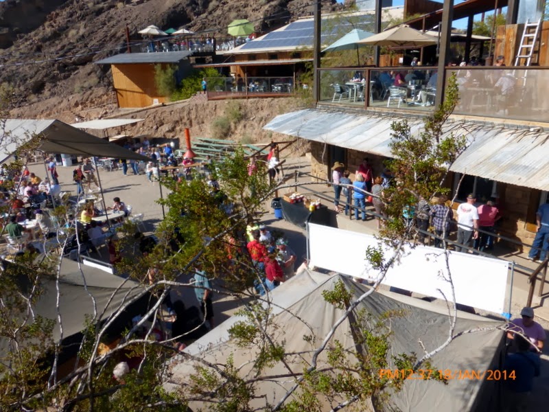 After we got our geocaching done for this trip, Earl worked on setting up a Ham Radio station at the trailer. We were at Quartzfest, here, all of last week and used the hand held radio, but now there was more time to get things set up in a more leisurely fashion. We had not established a plan for using the bigger radios when we are out and about in the trailer, so Earl was able to work on that without the distractions of seminars and everything else that was happening during Quartzfest. Bob helped with setting up and tuning the antenna seen above the back of out trailer. It looks like a very thin "T". The other smaller antenna at the front of the trailer is for the TV.